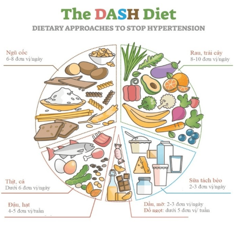 Chế độ ăn DASH là mô hình dinh dưỡng được Hiệp hội Tim mạch Hoa Kỳ khuyến nghị nhằm kiểm soát huyết áp. Chế độ này tập trung vào ngũ cốc nguyên hạt, rau xanh, trái cây, sữa ít béo, cá và thịt nạc.